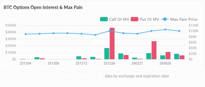 Total open interest in options: $55.26B, up +1.93% in 24 hours; maximum pain points concentrated at recent expiration dates (like December 5) at $90,000 and further out (March 2026) at $100,000, these positions may create a magnet effect on price.