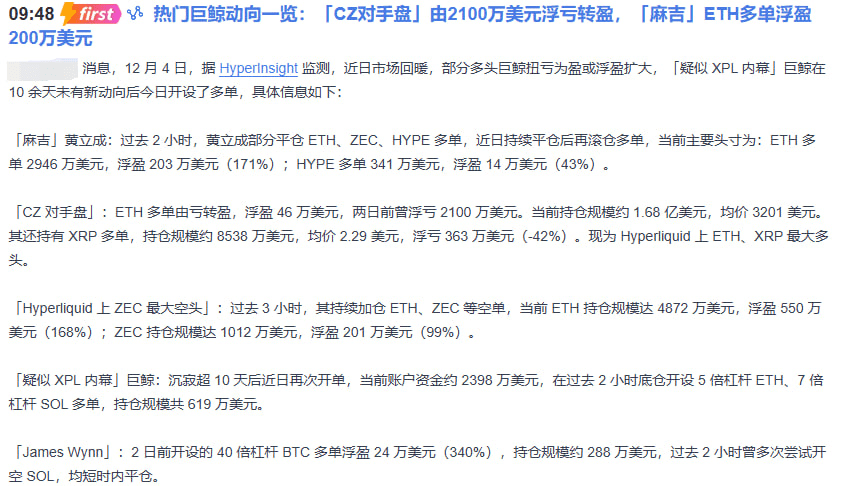 A whale has staged a remarkable comeback! According to HyperInsight monitoring, CZ's counterparty, a "whale," has shown astonishing performance in the past two days. Two days ago, it was down $21 million, but now its ETH long positions have a profit of $460,000, with a total position size of $168 million and an average holding price of $3,201. Even more impressively, it remains a major long position in ETH and XRP on the Hyperliquid platform. Furthermore, Maji's ETH long positions hold $29.46 million, with a profit of $2.03 million, making the long positions appear very strong. However, it's worth noting that the largest short seller of ZEC on the Hyperliquid platform is also increasing its ETH short positions, reaching $48.72 million with a profit of $550,000!