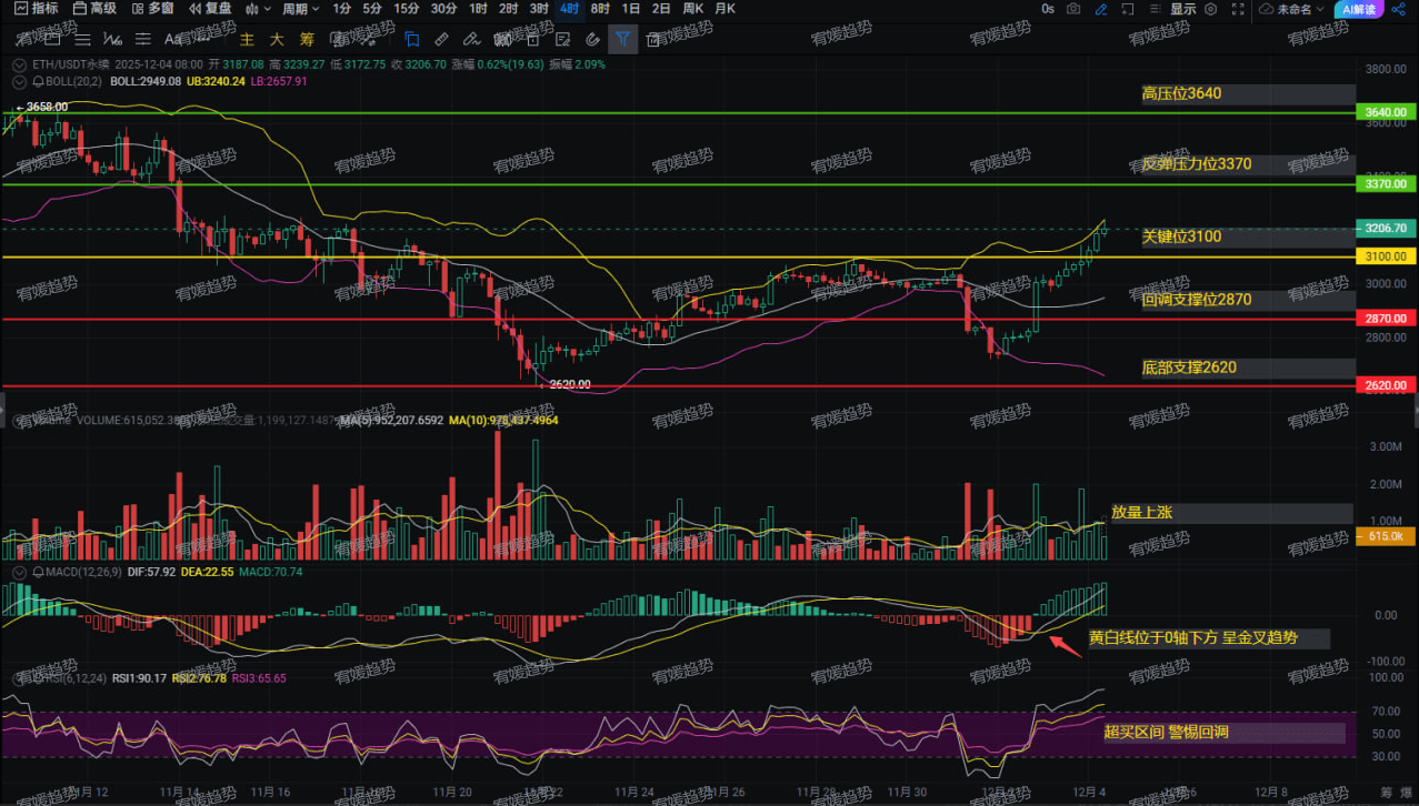 The candlestick chart shows a surge in volume, but the RSI indicator is issuing an overbought warning! On the main chart, the price is generally in an upward trend, currently at $3206, only 164 points away from the intraday resistance level of $3370. There's an even higher resistance level at $3640. Key support levels are at $3100, with a pullback support level at $2870 and a bottom support level at $2620, forming a clear upper and lower trendline.