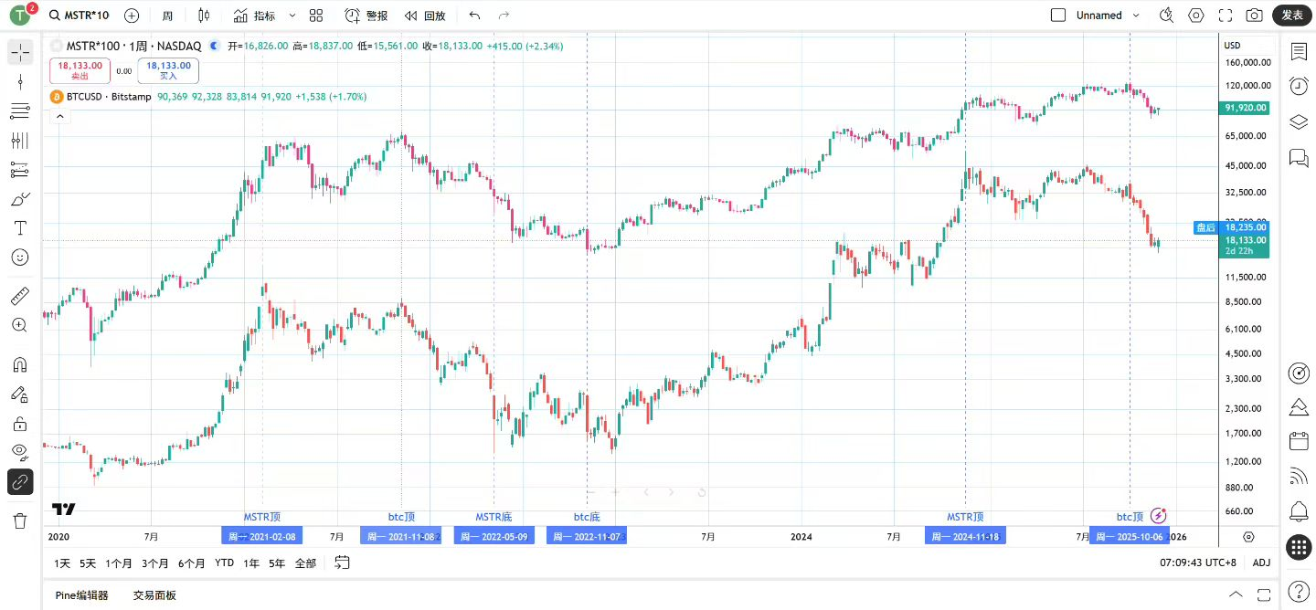 By comparing the weekly K-line of btc and MSTR, it can be seen: