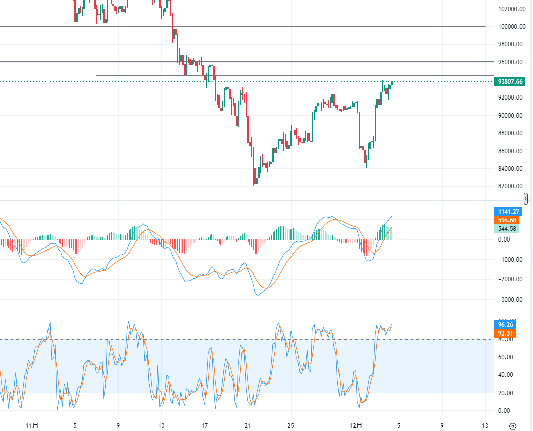 Bitcoin's short-term support focuses on 91500 USD and 90000 USD integer levels, the former is the starting point of the early morning rebound, while the latter is a recent oscillating bull-bear conversion platform, with dual support solidifying the correction baseline; resistance above is concentrated at 94500 USD, where this position overlaps with previous dense trading areas and Bollinger band pressure. If the evening initial unemployment claims data continues to show signs of employment weakness, a significant breakthrough may be anticipated to test the 96000 USD level.