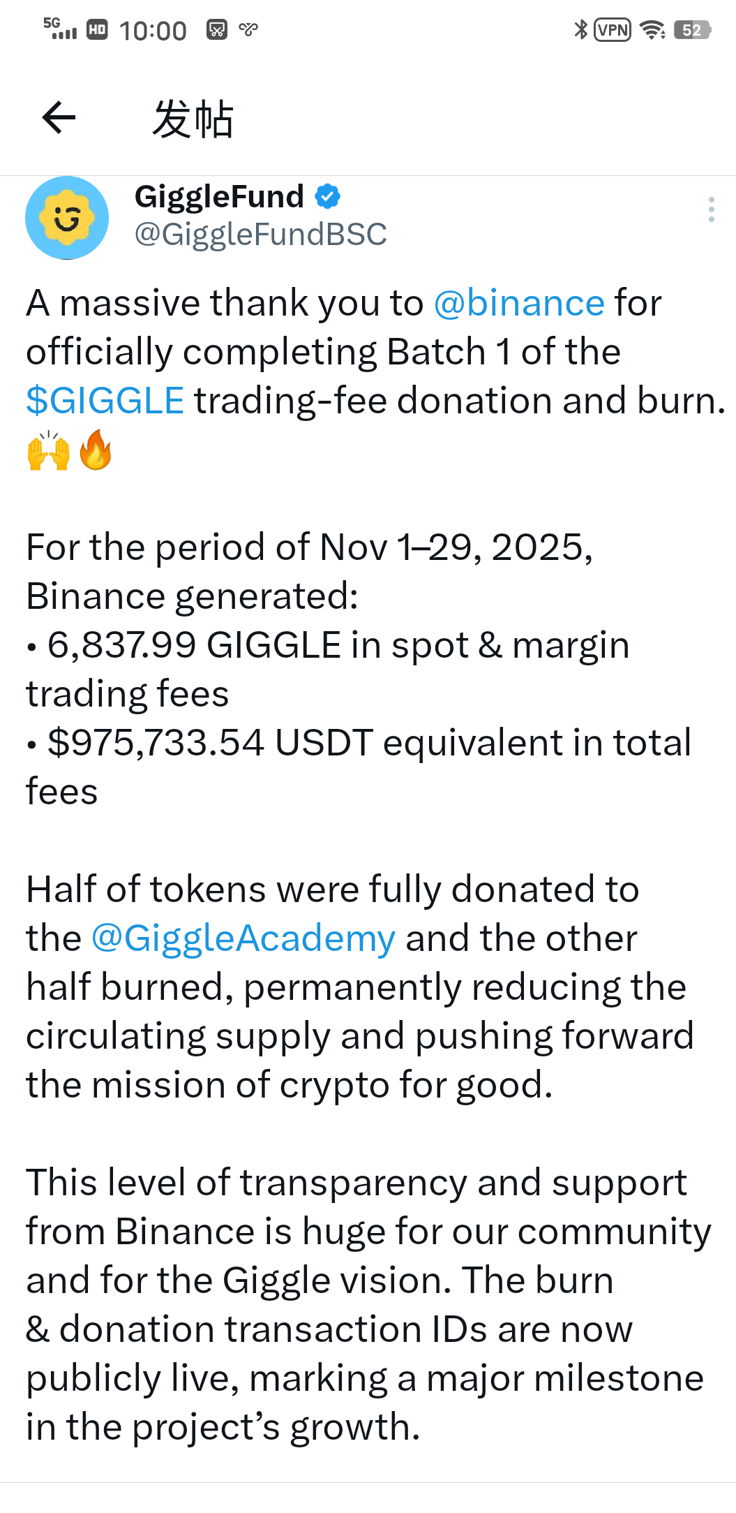 Academy, which will destroy half of the tokens, and convert the other half into BNB for charitable operations and educational project advancement - this is also the origin of Giggle's deflationary mechanism.