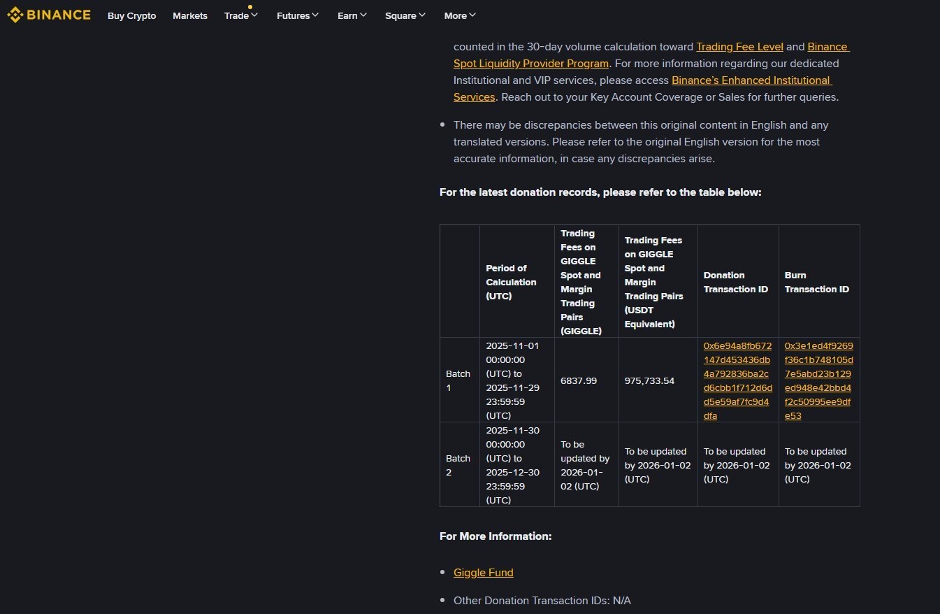 2. Specific trading fees on the Binance platform: Binance has clearly announced that starting from December 2025, 50% of the spot and leveraged trading fees for GIGGLE will be used for donations. These fees will be converted into GIGGLE tokens donated to Giggle.