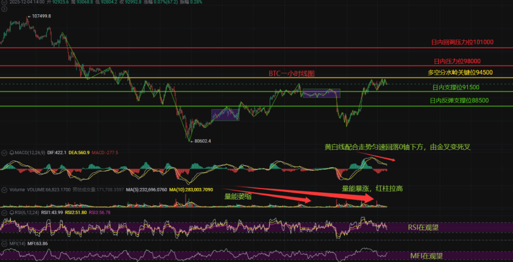 The dividing line between bulls and bears: $94500 is the “line of life and death”—if it stabilizes here, bulls may counterattack; if it breaks below, bears may gain the upper hand;