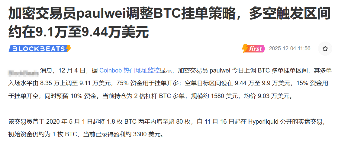 Crypto trader Paulwei has adjusted the BTC order strategy to 'long and short trigger range of $91,000-$94,400'. What does this mean? In simple terms, this range is the 'price switch'—once the BTC price drops below $91,000, bears may collectively crash the market; if it surges above $94,400, bulls may frantically increase their positions. The current price of $93100 is just at the 'lower edge' of this range, equivalent to standing on the 'edge of a cliff'—going up is paradise, going down is the abyss!