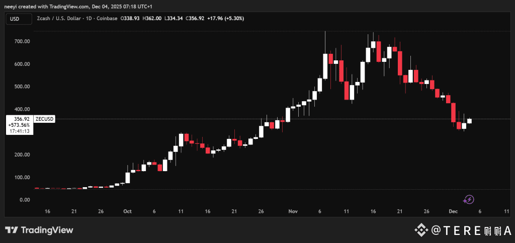 ZCash climbed explosively from a long, quiet base near $25–$40 and shot toward $745 before losing momentum. The price has since settled around $356, leading some observers to assume the move is over.