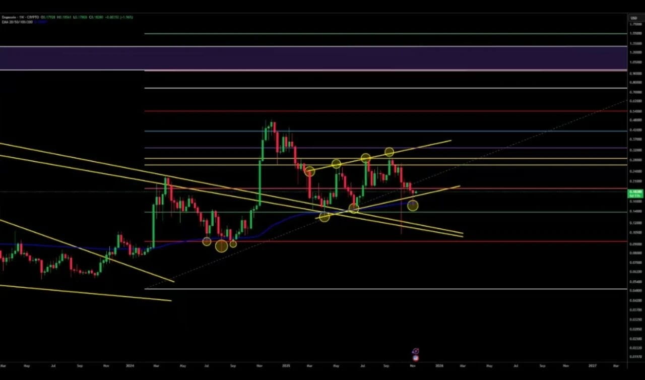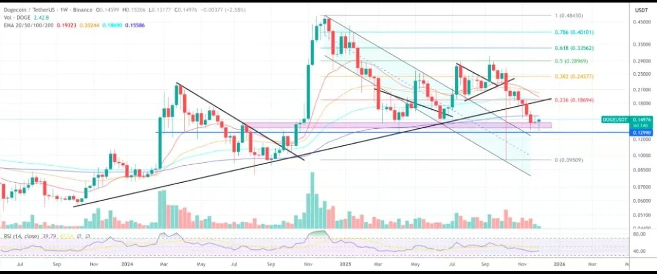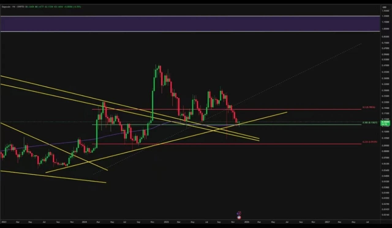 According to the technical chart drawn by Kevin, the key resistance level for Dogecoin is around $0.19 (corresponding to the 0.5 Fibonacci retracement level), while the ultimate support below is at $0.093 (the area where the 0.236 Fibonacci retracement level coincides with the long-term trend line).