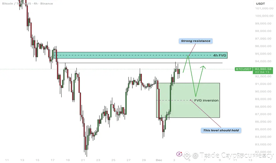 Bitcoin finds itself at an important turning point once again after a sharp decline followed by a strong recovery. In this update, we will cover the reaction to the previous 4H bearish FVG, the newly formed 4H FVG inversion acting as support, the next resistance level around 95,000 dollars, and the recent liquidity sweep.