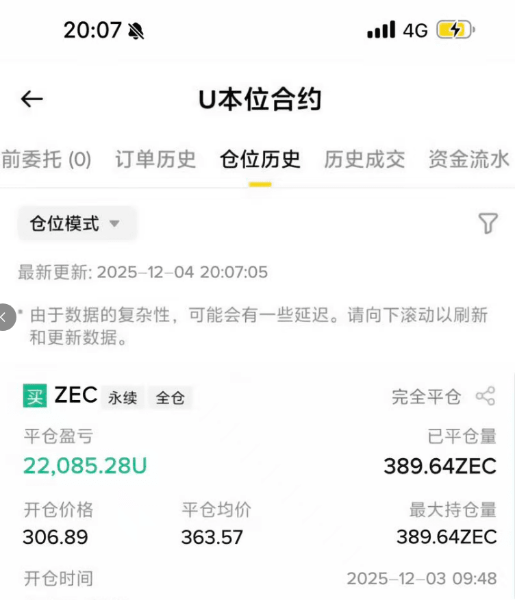 Just at 7:06 PM, I closed all my ZEC perpetual contract positions. Looking at the trade record with a profit of +22,085.28 USD, I feel very excited. This is undoubtedly the most successful trade I've had recently, worth recording and summarizing seriously.