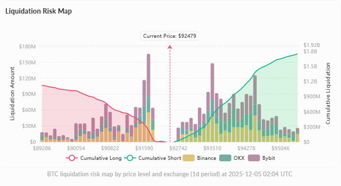 Short liquidation pressure above: Starting at $92,550 with only $367,000, accumulating over $1.7 billion by $95,430