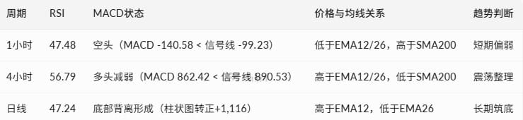 MACD short-term (1 hour/4 hours) shows weakening signals, and the volume indicator OBV continues to decline, reflecting insufficient buying momentum.