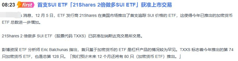 On December 5th, the ETF issuer 21Shares launched the first ETF tracking the price of SUI in the United States, which is also 2 times leveraged long, with the code TXXS, and it has already started trading on NASDAQ.