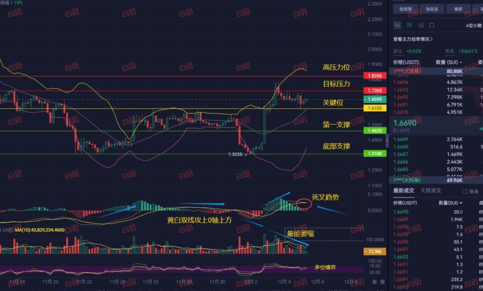 SUI's current price is $1.6610, almost sticking to the key level of $1.6690, like walking on a tightrope. There are resistance levels at $1.7260 and $1.8250 above, and a support level at $1.4620 below. In terms of technical indicators, although the yellow and white lines are still above the zero axis, there are signs of a dead cross, and trading volume has decreased, which indicates that both bulls and bears are watching and neither wants to act first.