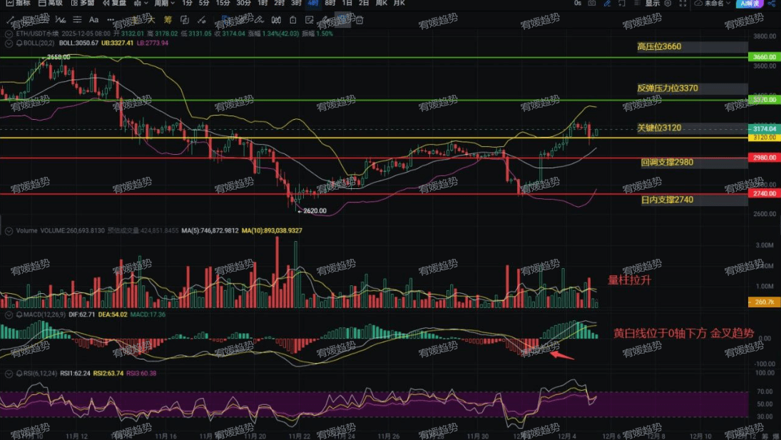 The current price is stuck at 3174, with the rebound pressure at 3370 just 152 points above us, like climbing stairs, it looks close but feels tiring. Looking further up, the big mountain at 3660 is suffocating, but there are three steps to support below: 3120 just stabilized, 2980 like a springboard, and 2740 is the floor price; if you can't step firmly, don't expect to jump up!