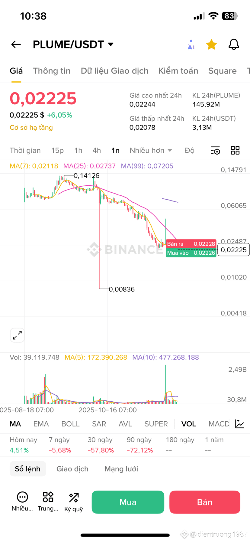 $PLUME Sai lầm của tôi cũng như nhiều anh em làm airdrop là quá tin tưởng vào dự án, điển hình là con Plume, hold đến nỗi giờ đã chia 10 chia 20. Quá buồn cho 1 năm qua. Nó sẽ sớm về 0.008$ thôi.