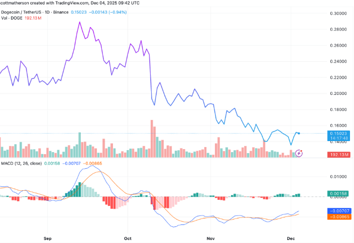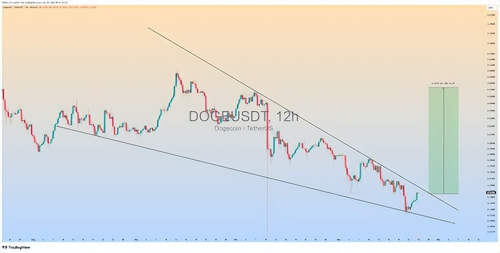 New analysis shared by cryptocurrency commentator Clifton Fx indicates that Dogecoin is forming a descending wedge structure. This pattern appears in a downtrend, with two downward-sloping trend lines gradually converging, and the price oscillates in a winding manner, with each rebound becoming smaller and the distance between the trend lines narrowing.