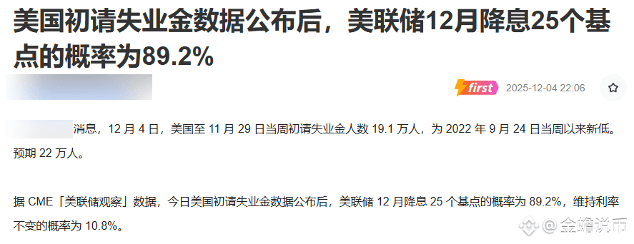 一边是昨晚的双利空矿工急着卖币套现、美国债雷炸了,把 SOL 按在地上摩擦;另一边是刚出的大甜点:美国失业金数据爆低,美联储 12 月降息 25 个基点的概率直接干到 89.2%!这就像给币圈塞了颗糖,但 SOL 现在多头太虚,这糖能不能咽下去还两说。