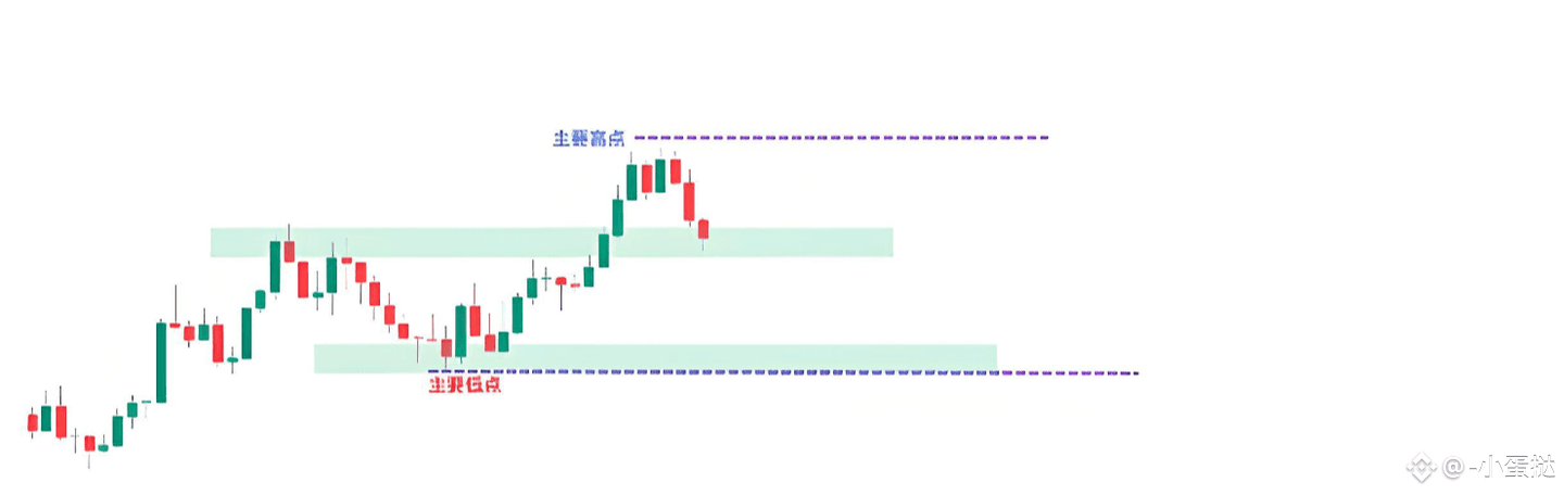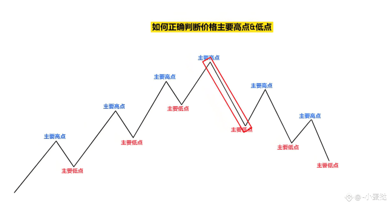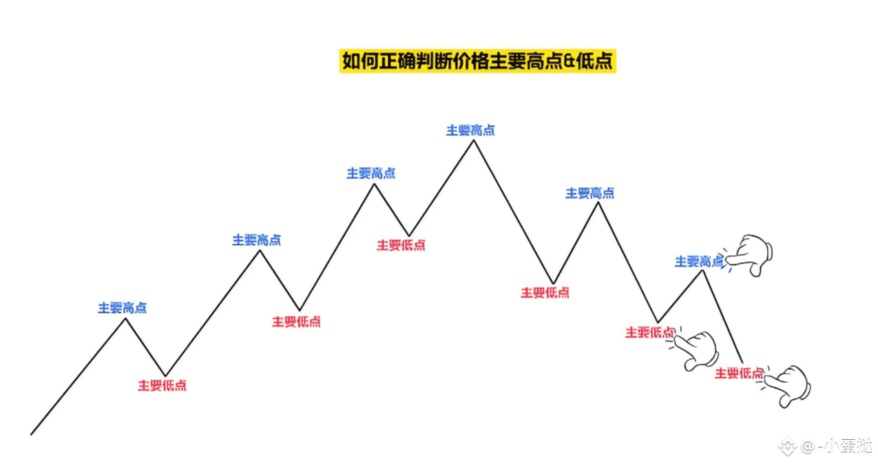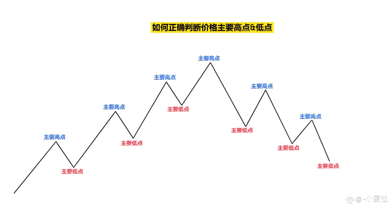 用市场结构交易,第一步也是最关键的一步:得会认价格的“主要高点”和“主要低点”。先看个简化示意图,帮大家建立基础认知: