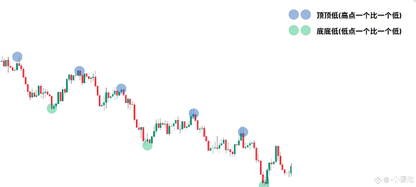 上升趋势里,主要低点是价格每次回调形成的,主要高点是价格突破前一个主要高点后形成的;就这样循环往复,不断出现“顶顶高、底底高”的结构,上升趋势就一直延续。直到这个结构被破坏——也就是价格跌破了之前的主要低点,形成“底底低”的结构,上升趋势就结束了,大概率反转成下跌趋势。