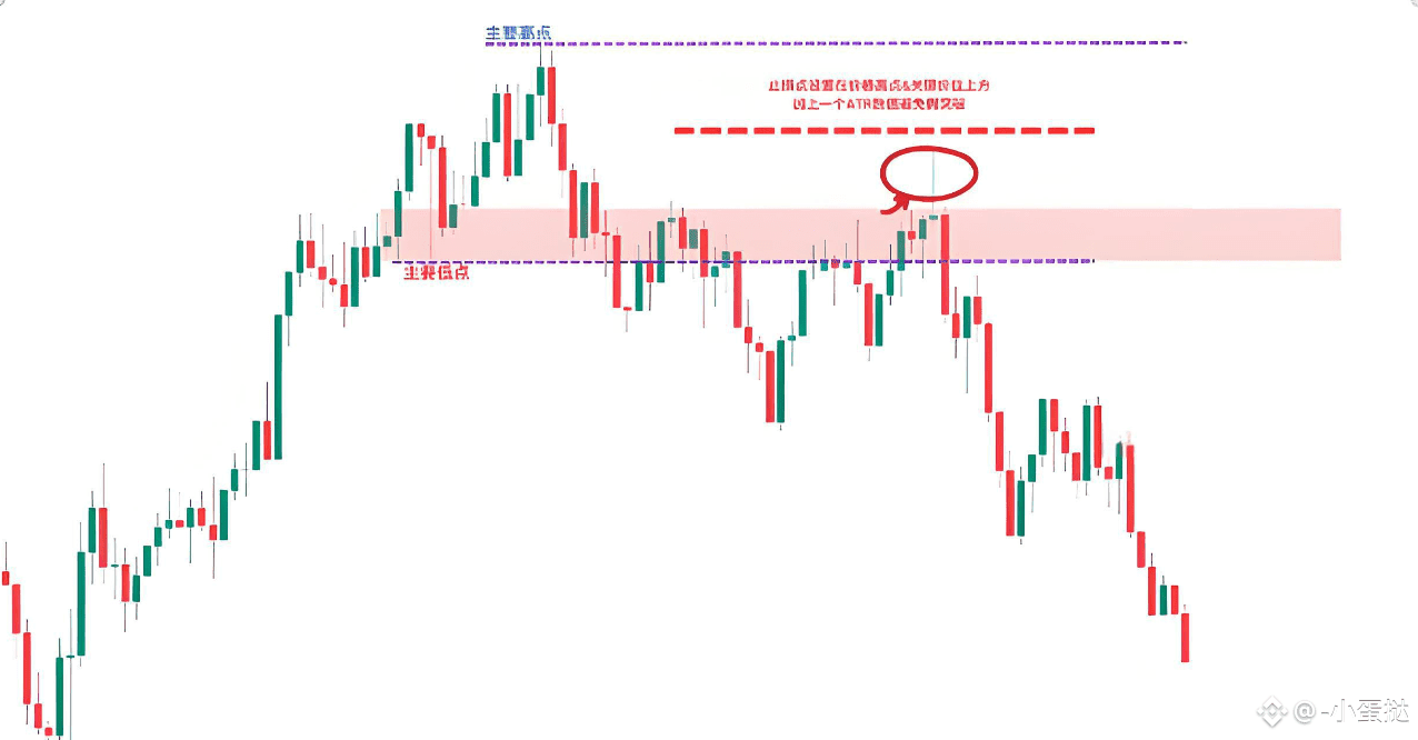 入场逻辑一样:等价格回调到“前期主要低点跌破后转阻力位”的位置,等看跌信号确认——图里出现了长上引线+看跌吞没两个看跌信号,说明空头动能强劲。在大阴线完全形成后做空入场,止损设在阻力位和近期高点的上方+1个ATR数值。