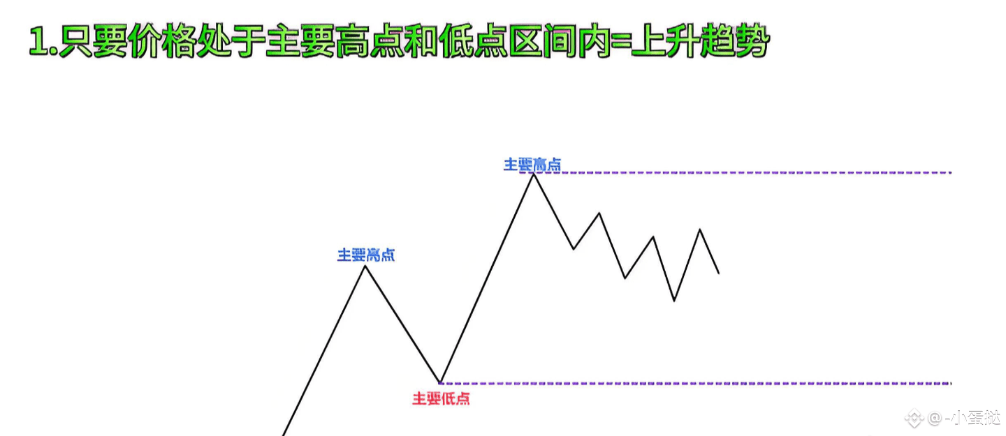 当价格突破前期主要高点,形成新的主要高点后,只要没跌破这一波趋势的主要低点,不管中间怎么震荡、怎么小回调,都属于当前上升趋势的正常回调,趋势没改。这样能避免你被中间的次要趋势结构迷惑,误判趋势方向。