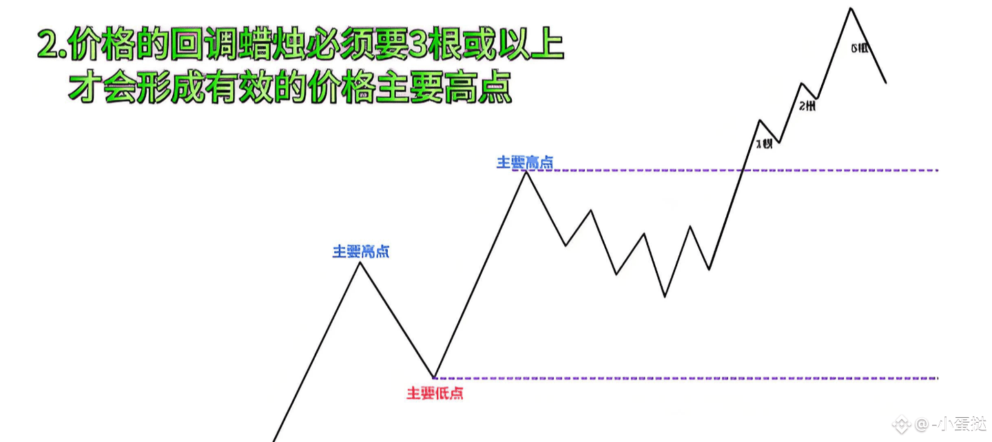 真实行情里,价格突破后会有很多小回调,但不是所有回调都能算“有效回调”,更不能据此定主要高低点。我的规则是:必须有至少3根蜡烛的回调,才算有效回调,才能形成新的主要高低点。