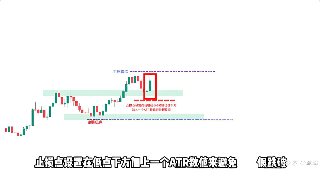 第三步:等信号入场+设置止损。图里价格回调到第一个关键价位(前期高点转支撑位)后,出现了看涨吞没形态,确认了多头动能,这时候就可以做多入场。止损设在这个支撑位下方+1个ATR数值,避免假跌破。