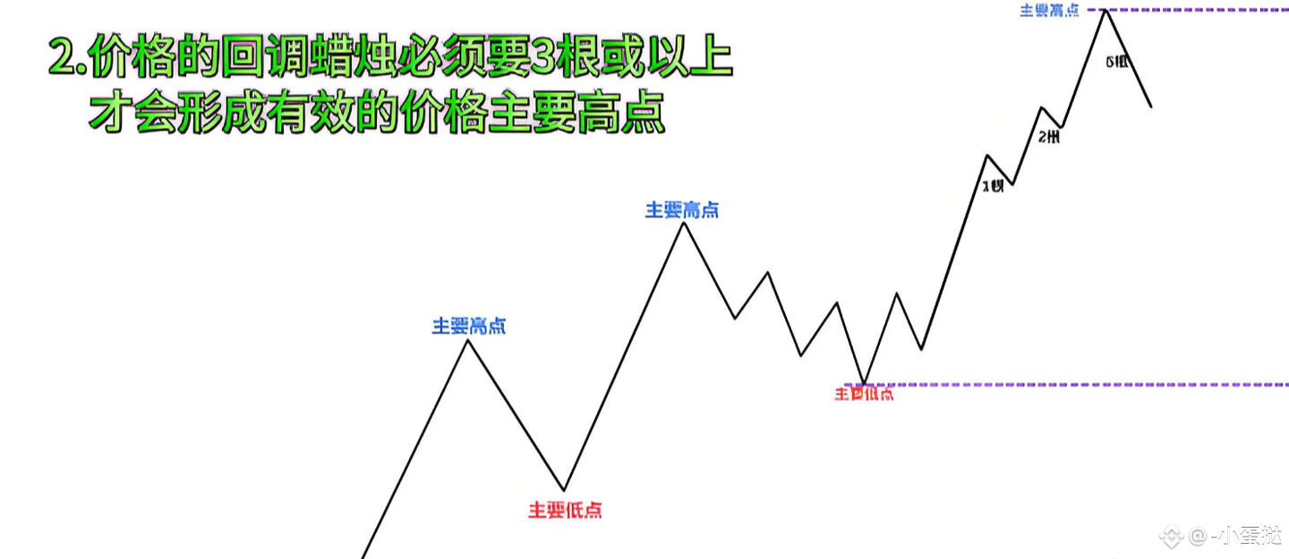 比如图里的小回调:1根、2根蜡烛的回调都不算数,只有等到5根蜡烛的回调出现,这时候形成的高点才算主要高点;对应的,这一波拉升的起始低点就是主要低点。只要价格在这两个主要高低点之间波动,都是上升趋势的正常回调。