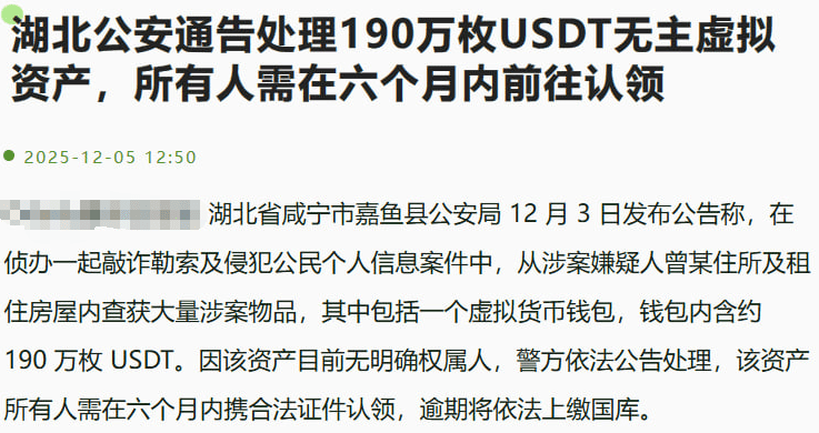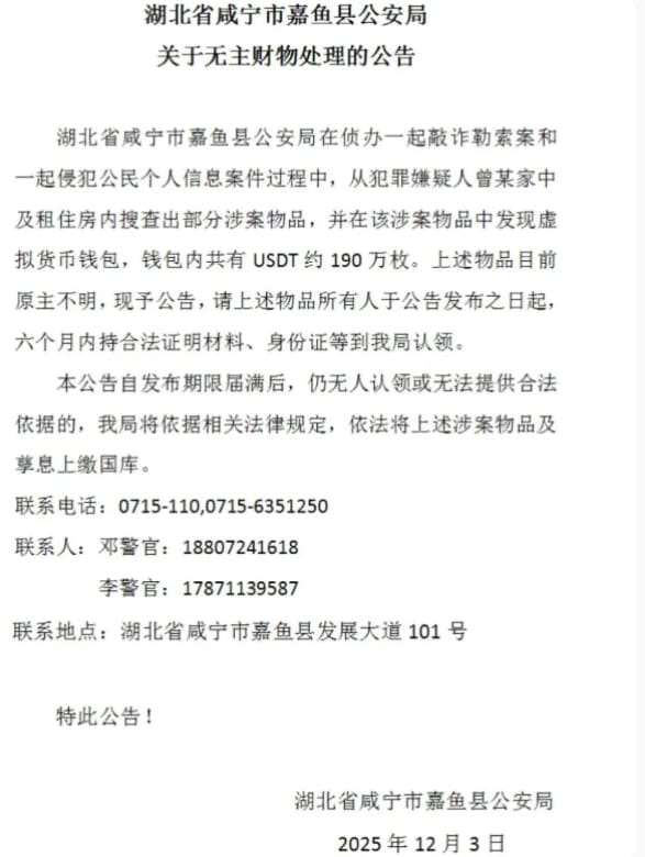 Brothers and sisters, I am Anna. Today, a message has gone viral in the circle: the Public Security Bureau of Jia Yu County, Hubei Province announced that they have seized a virtual currency wallet containing about 1.9 million USDT during their case investigation, and now the owner cannot be found, asking the 'owner' to claim it within six months, or it will be confiscated.
