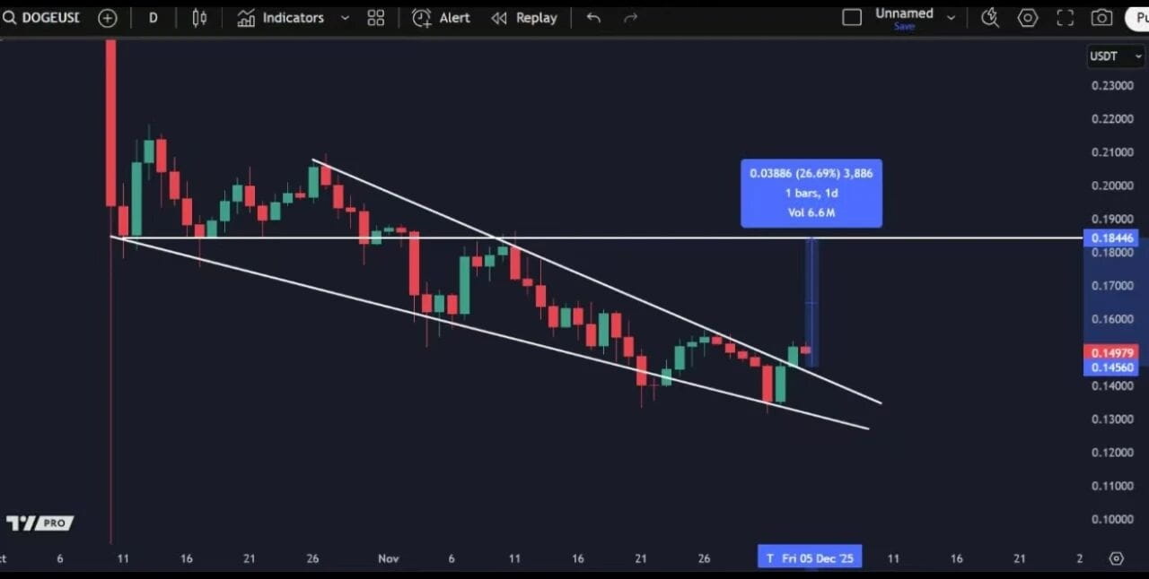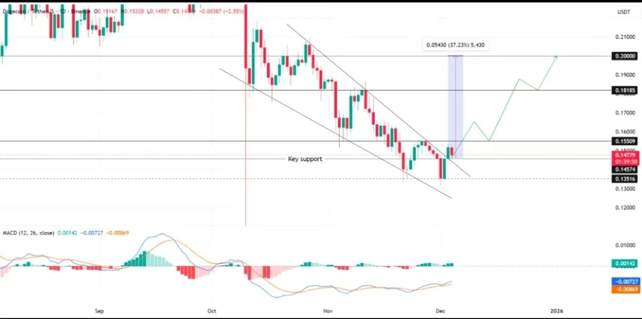From a technical perspective, Dogecoin has successfully broken upward from the daily descending wedge and has retested the upper boundary, forming solid support around $0.145.