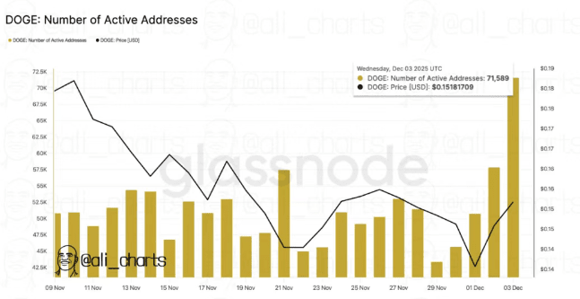 Fundamentals are also conveying active signs. Analyst Ali Martinez monitored that on December 3, the number of daily active addresses for Dogecoin surged to 71,589, a new high in nearly three months. This indicates that DOGE's network activity is recovering, and on-chain participation is clearly warming up.