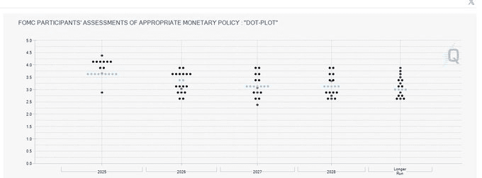 Currently, the interest rate for November is 3.88; from the dot plot, it can be seen that the interest rate expectations for the coming years are all downward, and after 2028 it is expected to reach 3.