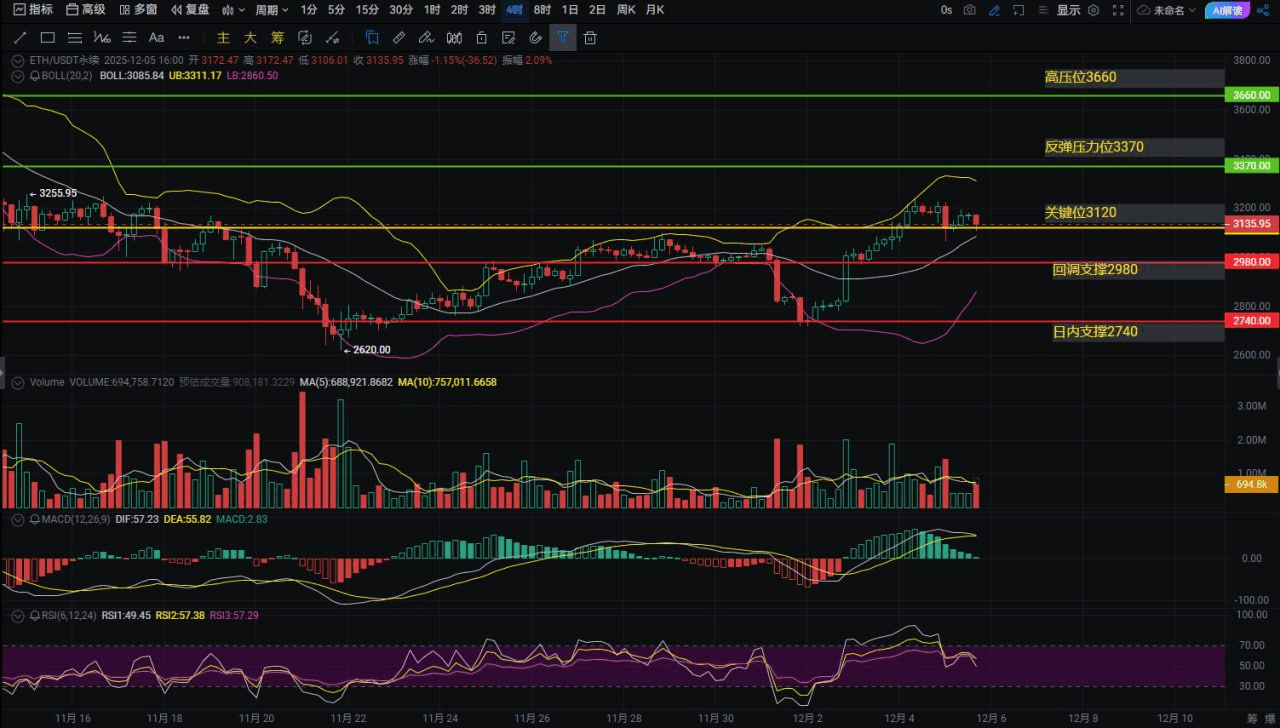 Looking at the 4-hour chart again, the overall market is declining, but the details hide the devil. I have marked the key positions: resistance at 3660, rebound pressure at 3370, critical position at 3120, support at 2980 and 2740. Currently, the MACD is dead cross above the 0 axis — this is called the 'top divergence' prototype, the upward momentum is weak, and it may drop first! But the lower Bollinger band is at 2860, and the RSI is still around 50, not oversold. This means the downside is limited, and a rebound is imminent. So the question arises: will it first drop to 2980 and hold, or will it directly break through 2740? My viewpoint may surprise you.