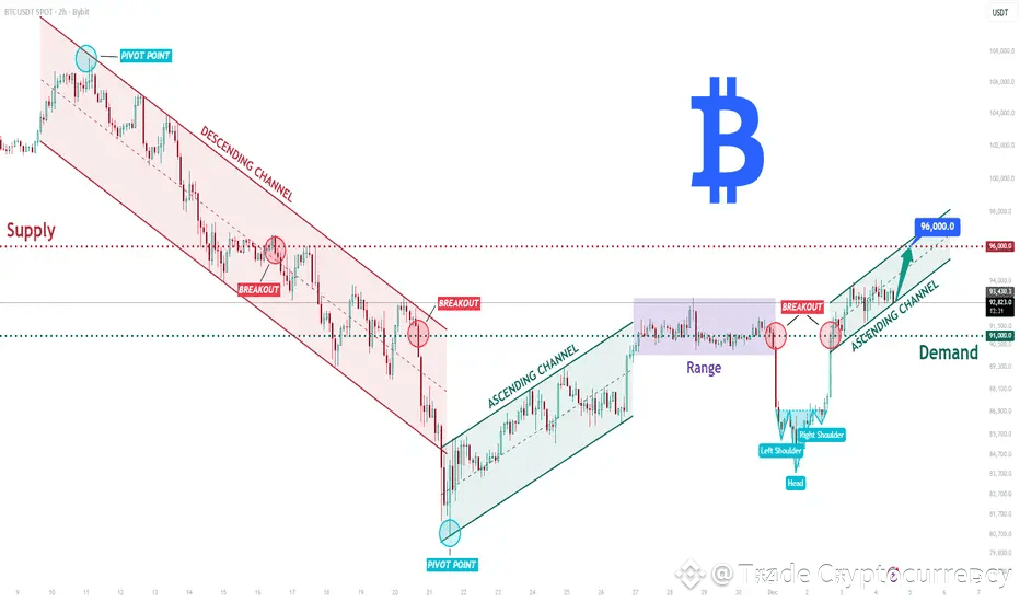 The current BTCUSDT price action is developing within a strongly structured bullish environment after a prolonged decline driven by the Descending Channel. Earlier, the market broke down from the upper supply region and continued to move lower while respecting the descending channel boundaries. After reaching a pivot low near the demand zone around 91,000, buyers stepped in, initiating a reversal and shifting momentum to the upside. Following this, Bitcoin formed a clean Ascending Channel that confirmed growing bullish pressure.