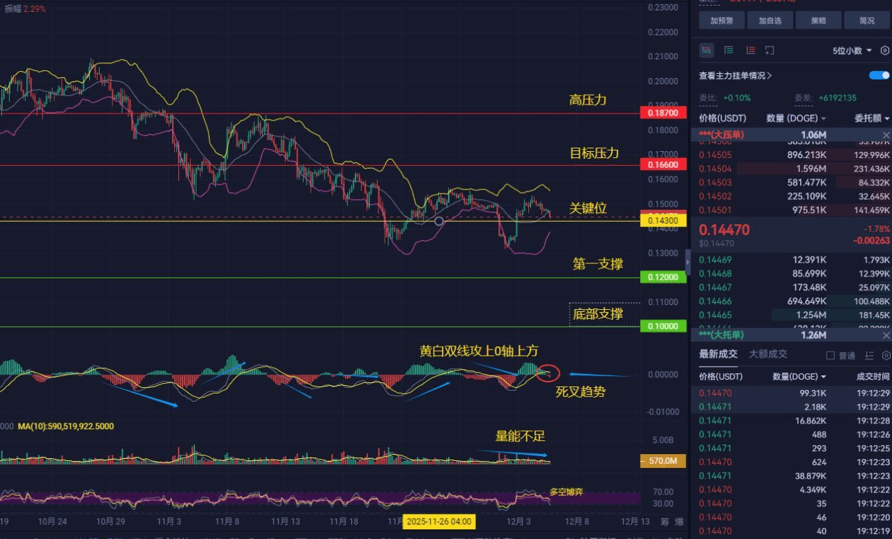 Let's look at this 4-hour K-line chart before us. Above 0.166-0.187, I have marked it as a 'high-pressure zone', where countless brothers who chased up previously are trapped. Every rebound near there will trigger desperate selling. And below, the line at 0.143 has been marked as a 'key level', this is the Maginot line for the bulls, once lost, the military morale will completely collapse. More critically, the MACD, although barely standing above the zero line, has already 'crossed dead', it's like when your heart rate starts to alarm while running, but you still want to sprint. Therefore, my core view is very clear: I am bearish and believe that any rebound towards 0.166 is an excellent exit opportunity, not an entry signal.