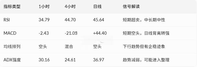 Daily level: Price is below all major moving averages (EMA12 $3,027, EMA26 $3,114, SMA50 $3,388), but MACD bars have turned positive at +44.40, forming a potential bottom divergence signal. ADX at 36.97 shows the trend remains bearish, but momentum is weakening.