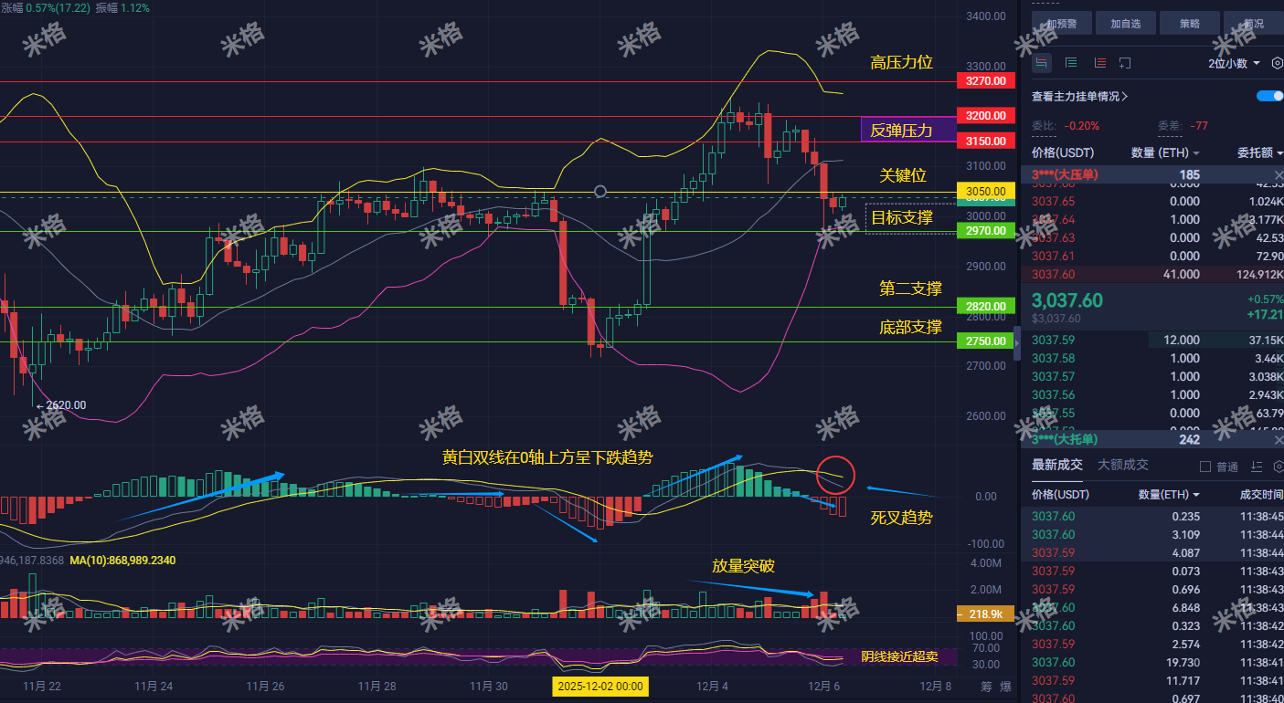 The MACD yellow and white lines are dead crossing above the 0 axis; what does this mean? It doesn’t mean an immediate crash, but rather that the upward momentum is weakening, and there is a short-term need for a pullback. However, if the price can hold at 3000-2970, the dead cross may turn into a 'pullback consolidation', preparing for the next golden cross to spike up.