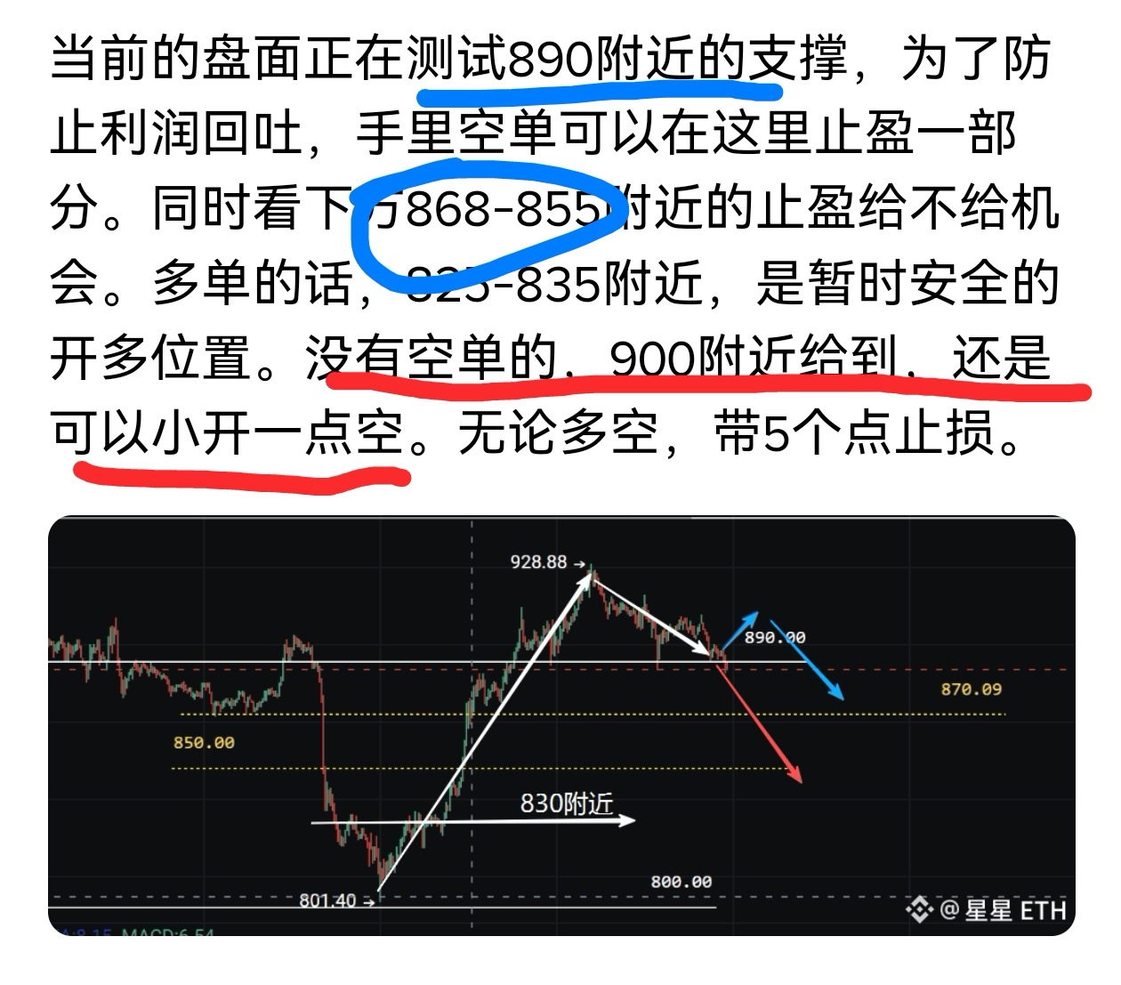 Yesterday, for BNB, I was holding a short position with an average price of about 915, with the take profit point set at 890 (partially taken profit here), and the remaining positions were set to target around 868 and 855. The market reached about 870, so it’s almost time to exit the short position. There’s a profit of about 45 points.