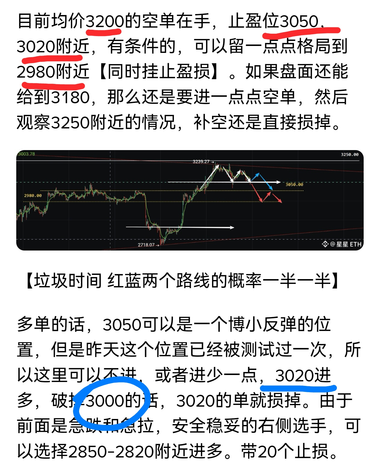 Last night, the stop profit position for the Ethereum strategy short position from 3050-3020 has been reached, and even the pattern point of 2980 provided an opportunity. Following this wave of market, 220 points have been captured!