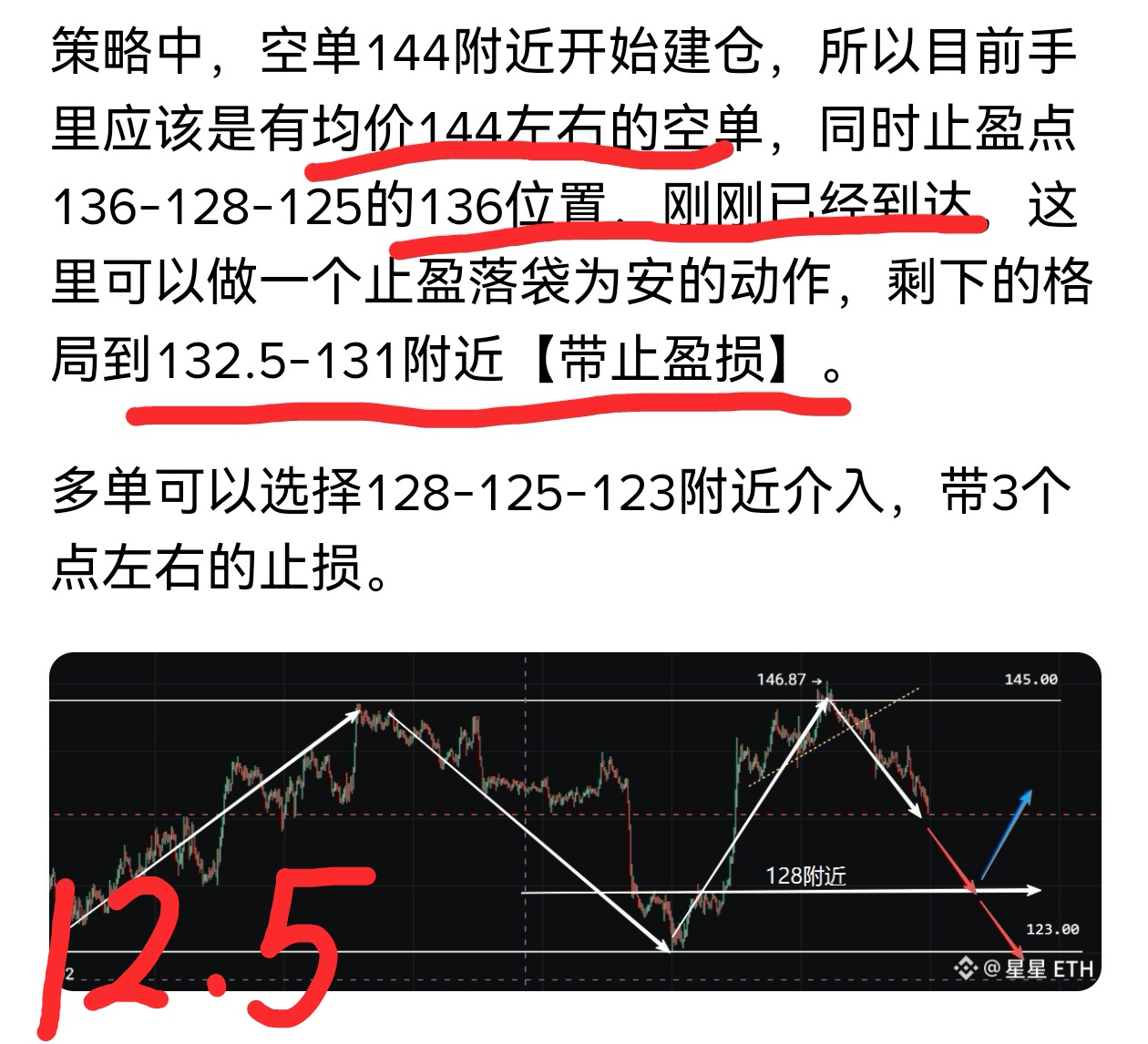 Yesterday's SOL average price short position at 144, gave a take-profit position at 136 (there was a reduction in position here), remaining structure to around 132.5-131. The market provided the position at 130.5, a very perfect exit point. Following this, gain around 11 points.
