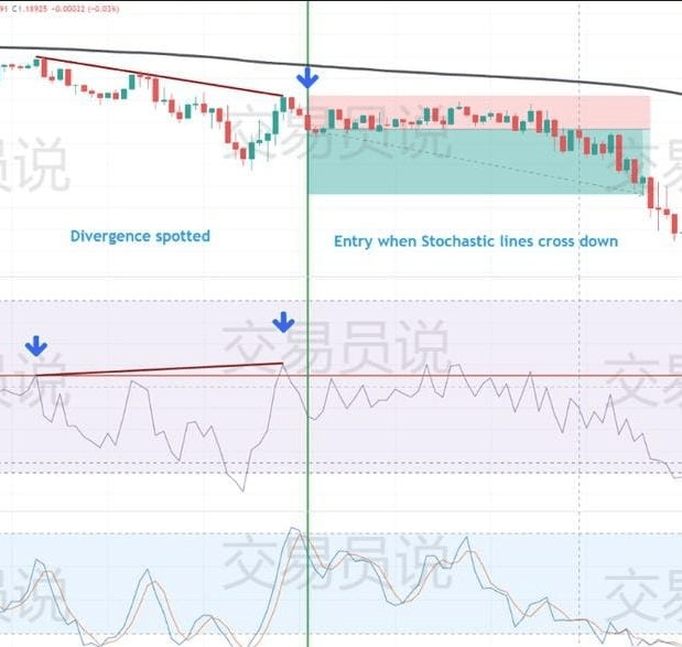 RSI divergence generates trade entry signals, which are then confirmed by the stochastic indicator. After you spot RSI divergence, only enter when the stochastic line crosses in the direction of the trend. To spot divergence, always draw a new horizontal line at the RSI lows and look for any new crosses below that line.