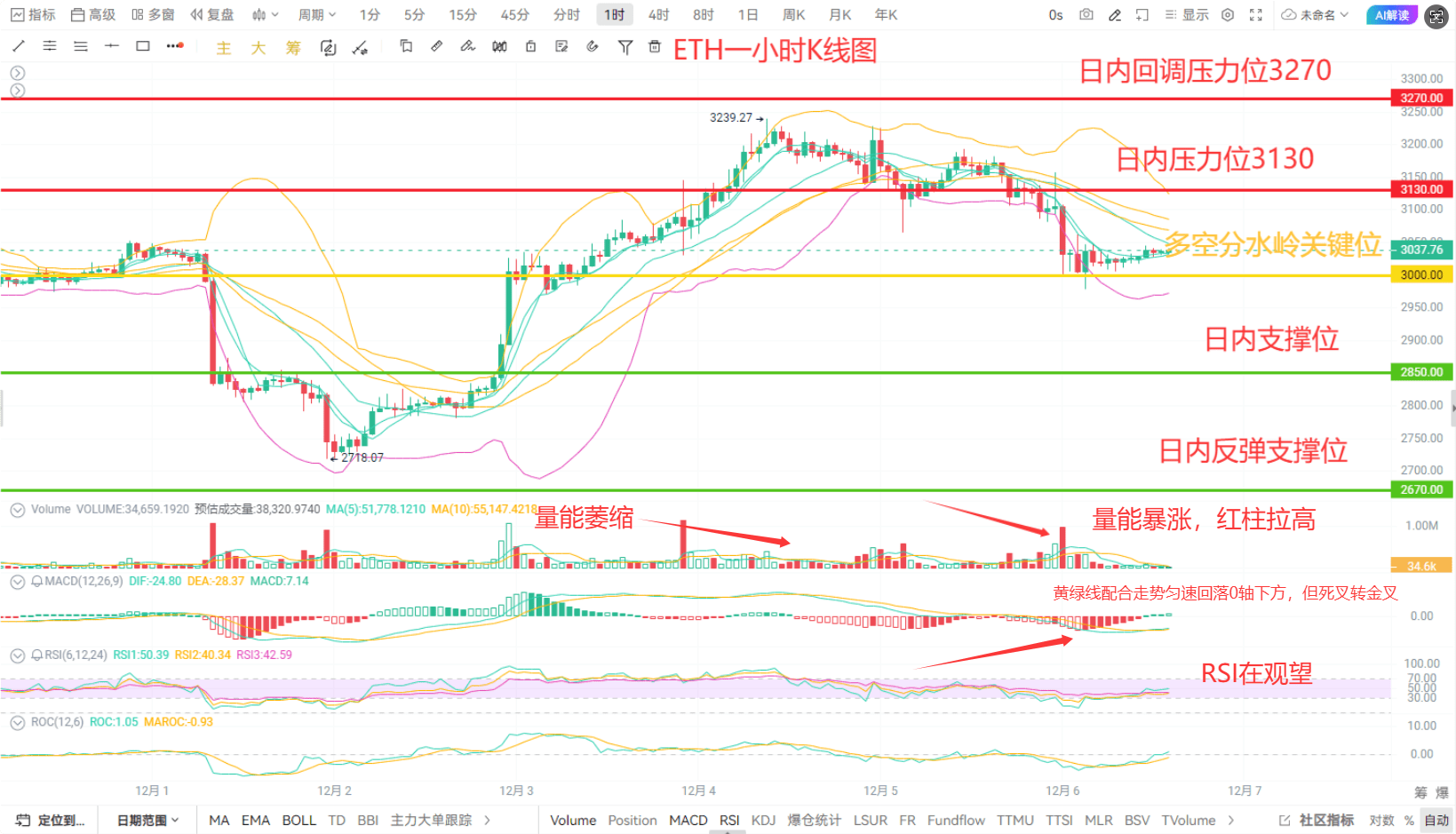Looking at the one-hour chart, the overall trend of ETH is indeed downward, and the current price is still being pressured below $3130. However, taking a closer look at the MACD indicator, the white line and yellow line have turned from a death cross to a golden cross below the zero axis. From a technical perspective, this is a signal for a short-term rebound, but don't be too optimistic, as this is occurring below the zero axis, and the rebound strength may not be very strong.