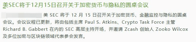 The SEC will hold a roundtable meeting on December 15, focusing on cryptocurrencies, financial oversight, and privacy, and has invited Zcash founder Zooko Wilcox. What does this meeting mean? The SEC's regulatory attitude towards cryptocurrencies is likely to become clearer! If regulation tightens, privacy coins like ZEC will be the first to suffer, and prices may worsen; but if positive news is released, such as recognition of privacy technology, then ZEC could soar. So, this will be a double-edged sword, and the market is currently watching.