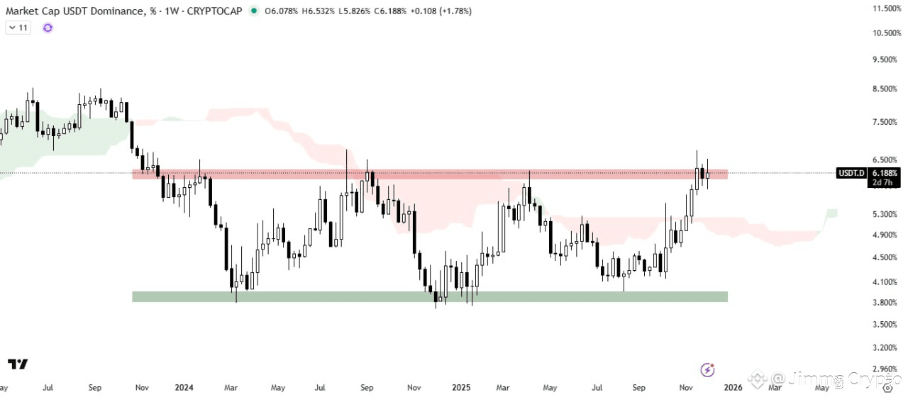 USDT Dominance is rebounding from the horizontal demand zone of the rectangle channel and is currently trading inside the horizontal supply zone, with the Ichimoku Cloud acting as support.