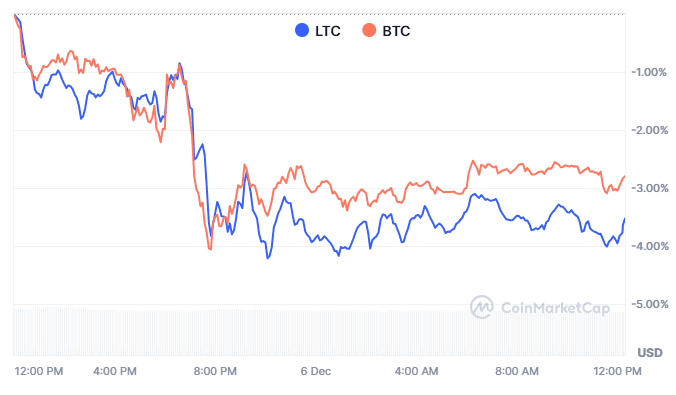 The comparative chart shows that LTC and Bitcoin have moved almost synchronously over the last day. Both assets fell sharply in the middle of the session. LTC demonstrated a stronger decline during this drop, reflecting its tendency for sharper reactions in calmer periods.