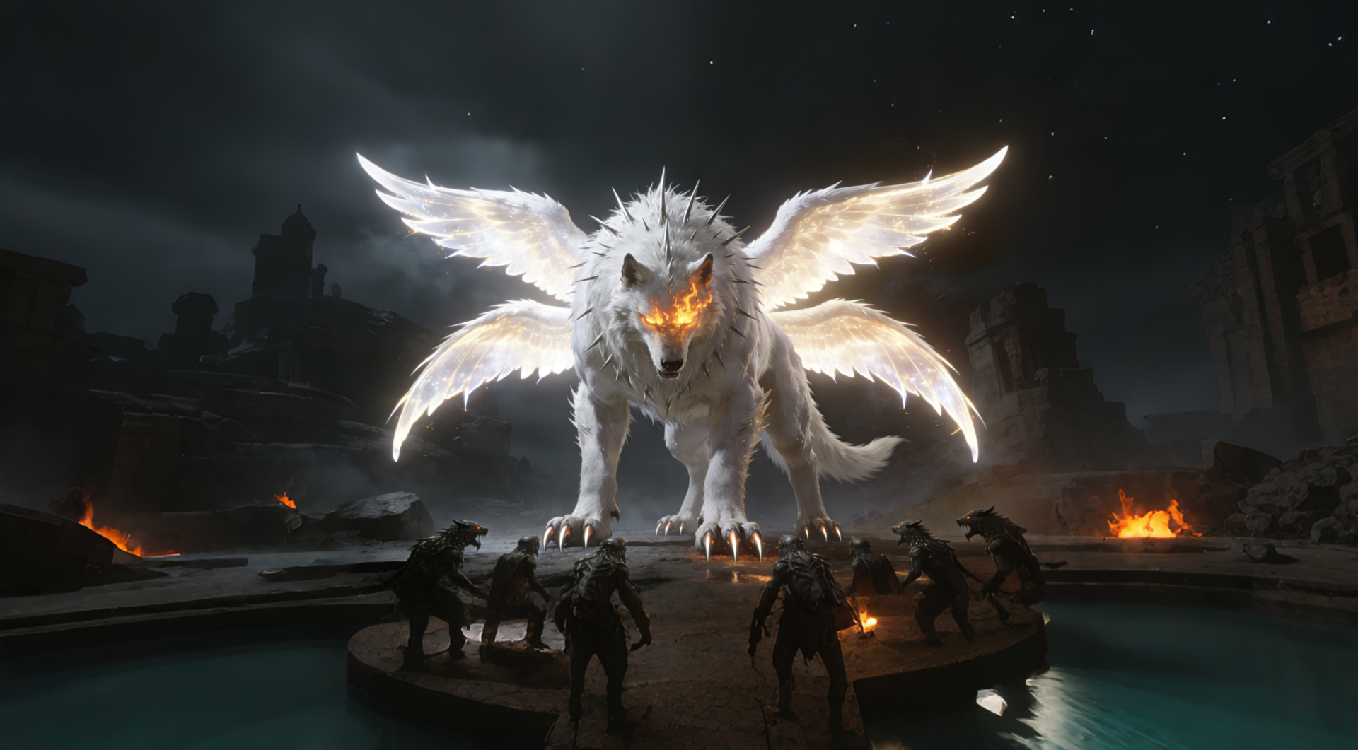 On the crimson battlefield, only the white giant beast stood proudly, its light wings slowly folding.
