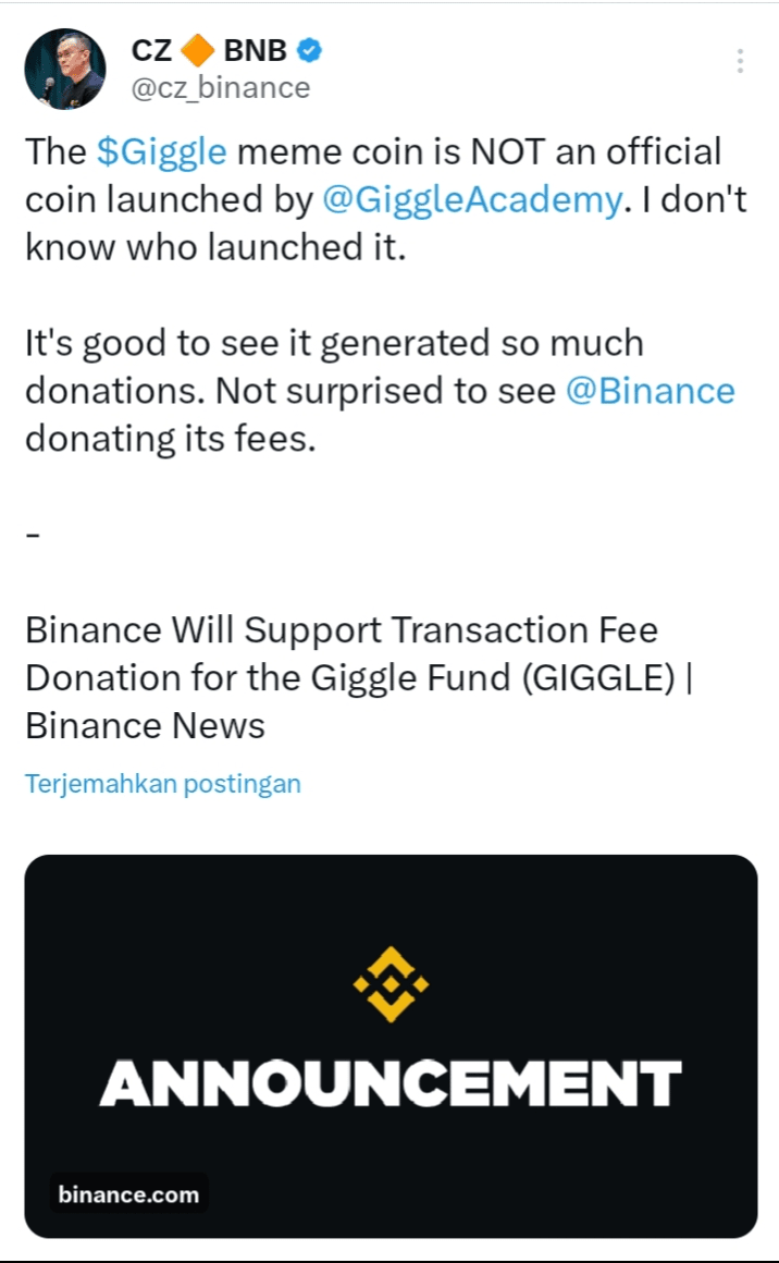 Seeing the hype that has been happening lately, many of you may be tempted to "All-in" on the Giggle Fund coin ($GIGGLE) thinking this is CZ's official project. Hold on! 🛑