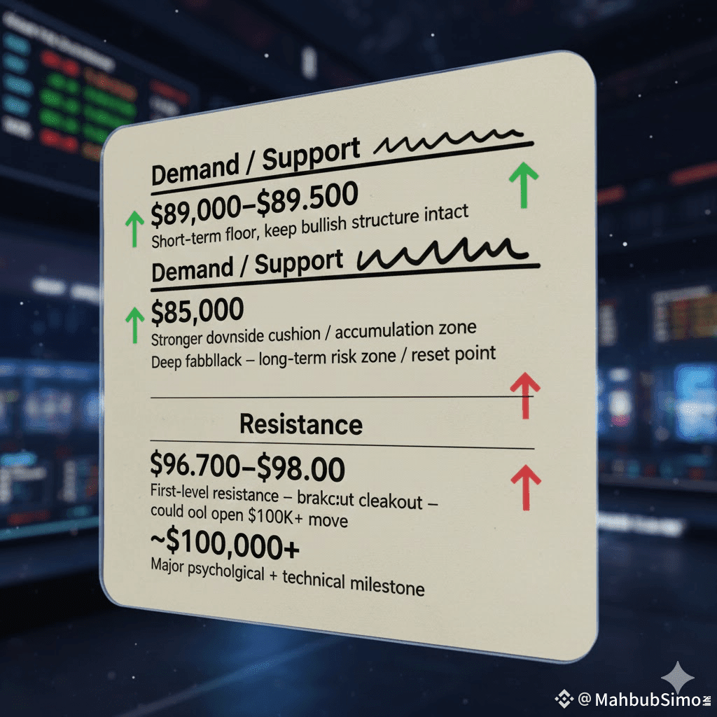• Cautious scenario: Rejection at resistance → retest $85K–$89K support