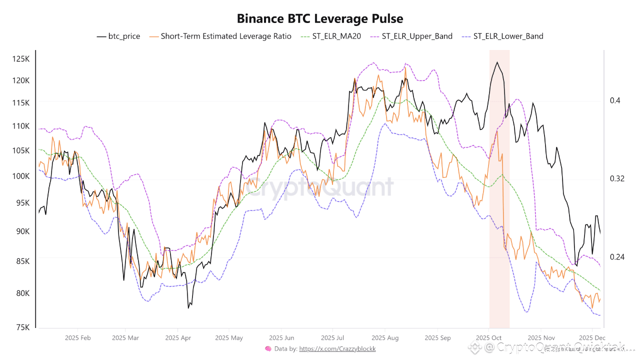 Binance Leverage Pulse (ST_ELR) confirms this backdrop. The latest ST_ELR at 0.198 sits slightly below its 20-day mean (MA20 ≈ 0.205), with a negative z-score. In simple terms: Binance’s leverage relative to stablecoin reserves is normal and cooling, not stretched or stressed. That reduces the risk of forced liquidations and gives the market space to stabilize.