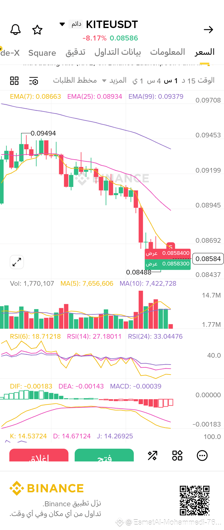 رغم التراجع اللحظي في سعر KITE إلى 0.08586 USDT بنسبة انخفاض -8.17%، إلا أن المؤشرات الفنية ترسم لنا لوحة مثيرة تستحق التأمل. إليك نظرة تحليلية سريعة ومُلهمة: